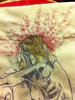 My previous exhibits have included - a deck chair; little wooden waves, a seabed and some painted inflatable rings...what could I do that I could post, but would be weather proof, dog proof, child proof and large enough not to get lost in the vast expanse of the site. Maybe subliminal messages from the recent jubilee and Olympics have got to me...bunting is the ideal thing. Bunting to celebrate creativity, the female form, international relations, friends, bunting long enough to go round the world.